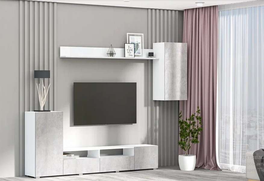 Компактная стенка для гостиной с большой нишей под телевизор, с небольшими пеналами и открытыми полками для книг и других предметов быта.
