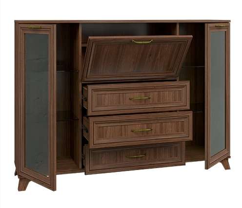 Слева и справа за стеклянными дверцами симметрично расположены секции, в каждой из которых имеется по две полки. Посредине в верхней части размещается отделение с откидной створкой. А снизу в центральной части тумбы находятся три глубоких выдвижных ящика. Изделие опирается на небольшие, но устойчивые ножки.