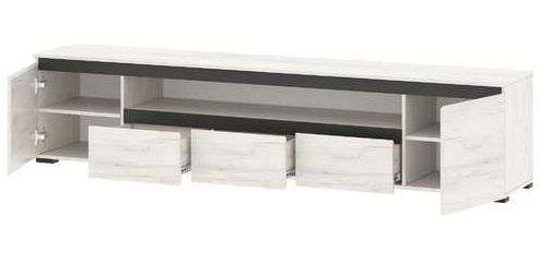 Тумба для ТВ «Гретта» 2250 2С3Я обладает геометрическим силуэтом и привлекательной цветовой палитрой, превращая новинку в стильный модуль, который прекрасно дополнит современный интерьер гостиной.