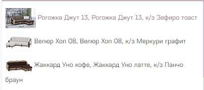 Изготавливается в ткани: Рогожка Джут 13, Рогожка Джут 13, к/з Зефиро, Велюр Хоп 08, Велюр Хоп 08, к/з Меркури графит, Жаккард Уно кофе, Жаккард Уно латте, к/з Панчо браун, Велюр Нью-эра 18, Велюр Нью-эра 18, Велюр Нью-эра 09, Велюр Цитус кэмел, к/з Меркури дарк браун(санни).