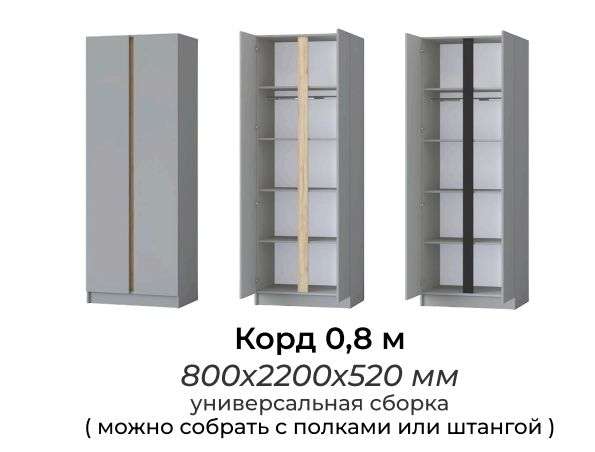 Шкаф «Корд» 0,8м входит в шкафную группу «Корд» ,которая имеет в своем составе шкафы различных размеров и цветовых решений. Ширина 0,8м ,1,0м, 1,2м , 1,5м ,1,6м , 2,0м. Цветовая гамма: Белый древесный, Дуб крафт золотой, комбинированный Дуб крафт золотой/ Белый древесный, Графит, Кашемир, Графит/ Крафт золотой , Серая Гавань.